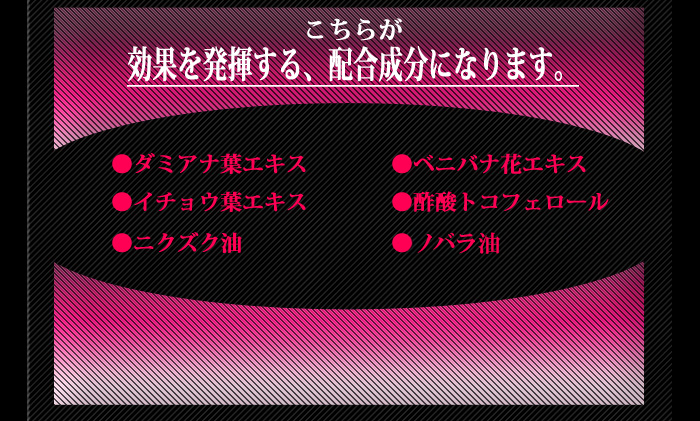 原材料名 水、グリセリン、セタノール、BG、パルミチン酸エチルヘキシル、ステアリン酸グリセリン(SE)、シクロペンタシロキサン、ジメチコン、ダミアナ葉エキス、ベニバナ花エキス、イチョウ葉エキス、酢酸トコフェロール、ニクズク核油、ノバラ油、(アクリル酸ヒドロキシエチル/アクリロイルジメチルタウリンNa)コポリマー、ステアリン酸ソルビタン、エタノール、EDTA-4Na、香料、メチルパラベン、プロピルパラベン、赤106