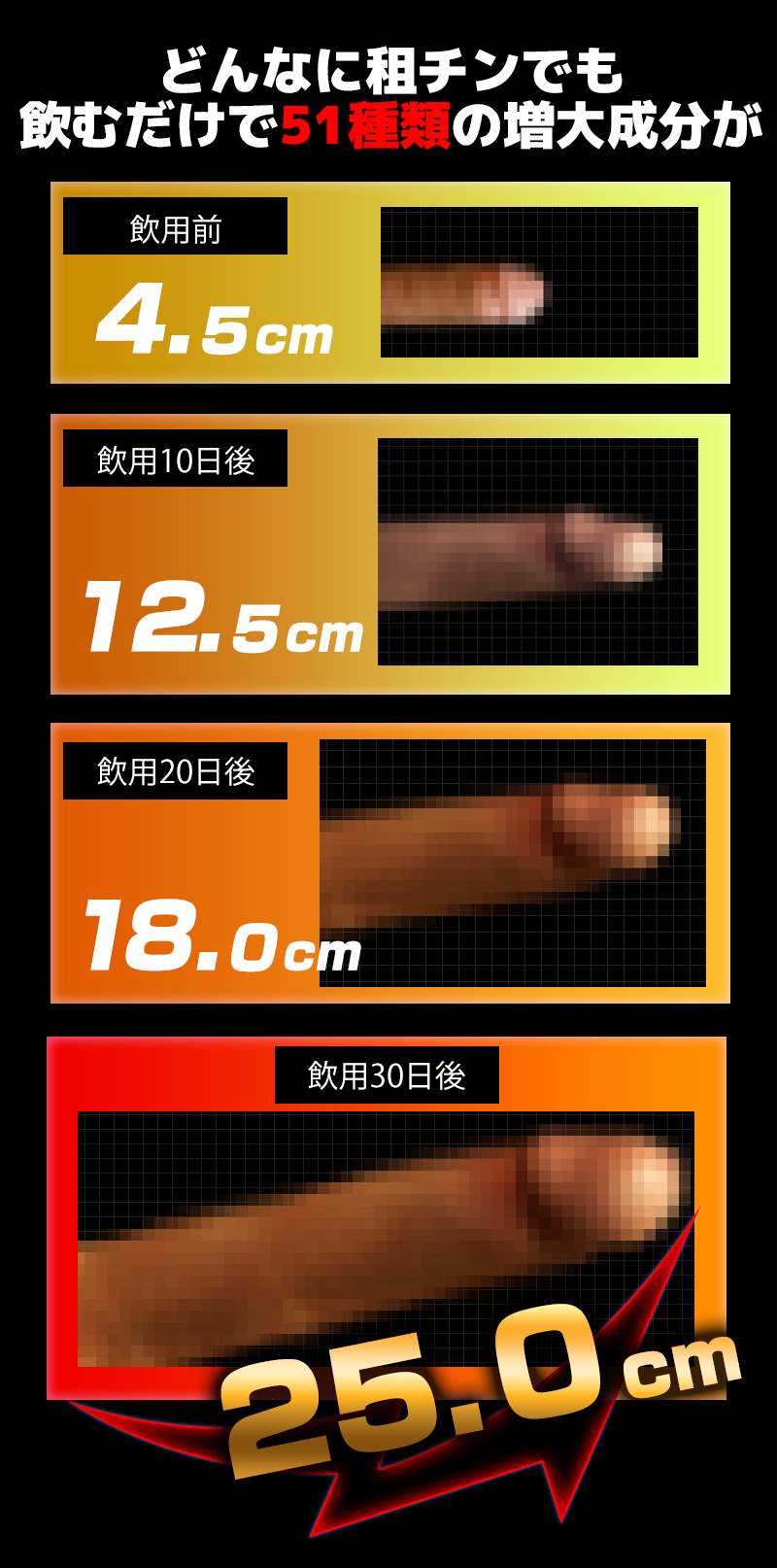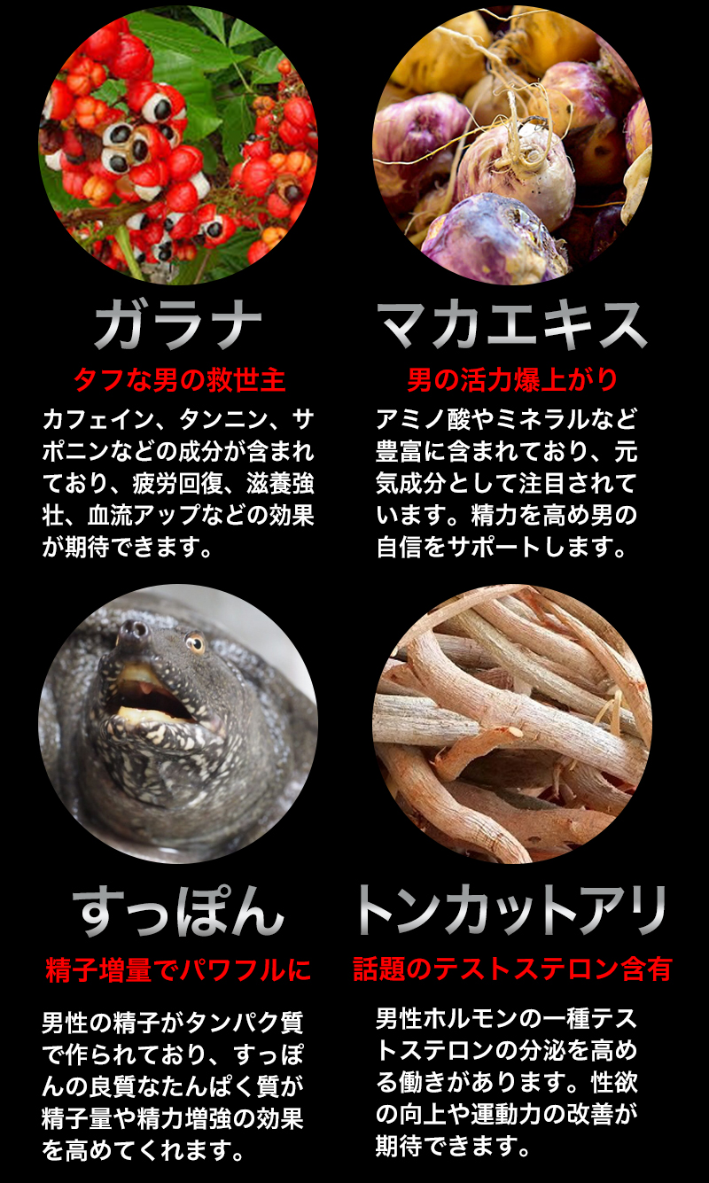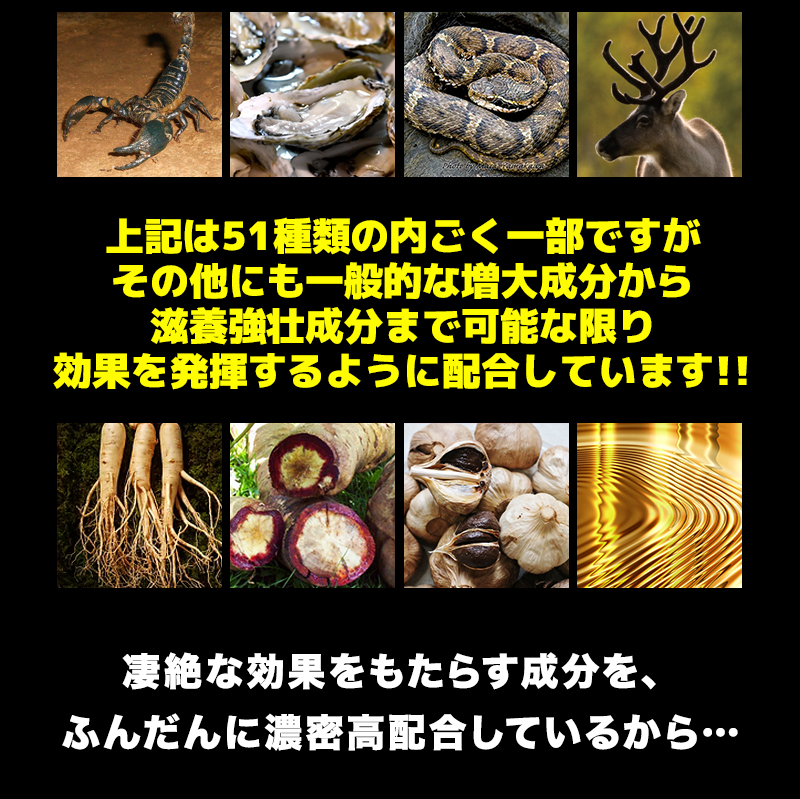 | 原材料名 | マカエキス末(国内製造)、べに花油、マムシ粉末、サソリ末、L-シトルリン、L-オルニチン塩酸塩、α-リポ酸、亜鉛含有酵母、キダチアロエ末、アリ末、アカガウクルア末、秋ウコン、ニンニクパウダー、牡蠣エキス末、γ-アミノ酪酸、ロディオラエキス、ガジュツ末、金時ショウガ末、グリーンコーヒー豆エキス、生姜末、すっぽん粉末、セージ末、エラスチンパウダー、ガラナ末、カロペプタイド(乳糖、オットセイ骨格筋抽出物)(乳成分を含む)、田七人参、冬虫夏草粉末、フェヌグリーク種子抽出物、トンカットアリ末、トナカイ幼角末、高麗人参末、ビール酵母、醗酵黒タマネギ、ヒハツエキス末、蜂の子粉末、ムイラプアマ(地上部)エキス末、醗酵黒ニンニクパウダー、乳たんぱく質、ローヤルゼリー、ワイルドヤムエキス末(やまいもを含む)、ノコギリヤシエキス粉末 / セルロース、活性炭、ステアリン酸カルシウム、微粒酸化ケイ素、L-トリプトファン、L-ヒスチジン塩酸塩、L-バリン、クエン酸、L-アルギニン、L-チロシン、L-ロイシン、L-イソロイシン、カフェイン(抽出物)、香辛料 |