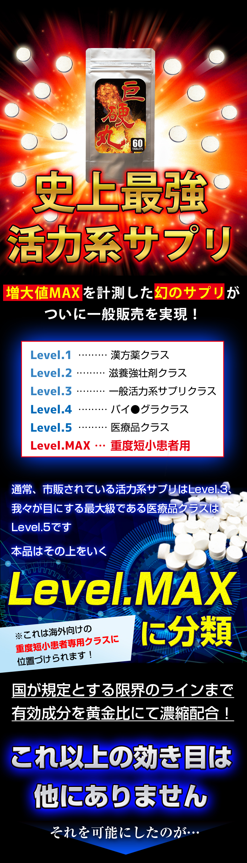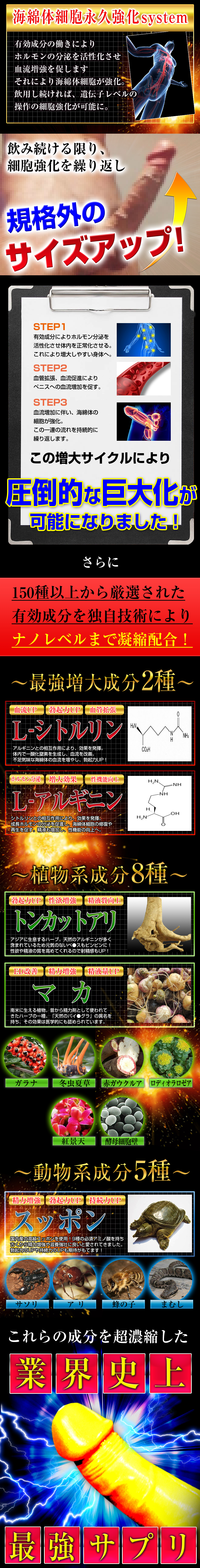 原材料名 | トンカットアリ末(国内製造)、マカパウダー、L-シトルリン、ビール酵母、サソリ末、ガラナ末、アリ末、冬虫夏草粉末、蜂の子粉末、ロディオラエキス、すっぽん粉末、マムシ粉末、コウケイテン末、アカガウクルア末 / セルロース、ステアリン酸カルシウム、微粒酸化ケイ素、L-アルギニン |