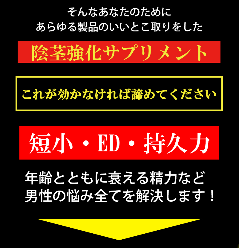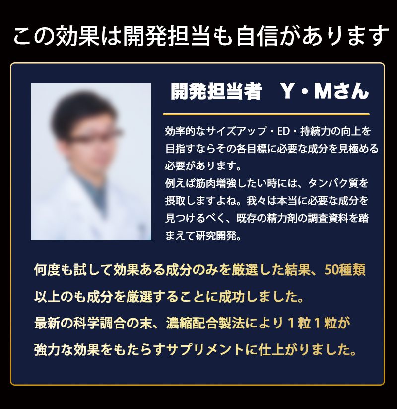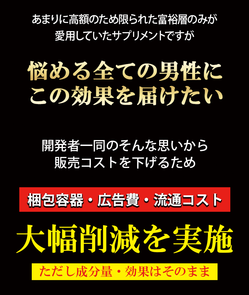 | 原材料名 | マカエキス末(国内製造)、べに花油、マムシ粉末、サソリ末、L-シトルリン、L-オルニチン塩酸塩、α-リポ酸、亜鉛含有酵母、キダチアロエ末、アリ末、アカガウクルア末、秋ウコン、ニンニクパウダー、牡蠣エキス末、γ-アミノ酪酸、ロディオラエキス、ガジュツ末、金時ショウガ末、グリーンコーヒー豆エキス、生姜末、すっぽん粉末、セージ末、エラスチンパウダー、ガラナ末、カロペプタイド(乳糖、オットセイ骨格筋抽出物)(乳成分を含む)、田七人参、冬虫夏草粉末、フェヌグリーク種子抽出物、トンカットアリ末、トナカイ幼角末、高麗人参末、ビール酵母、醗酵黒タマネギ、ヒハツエキス末、蜂の子粉末、ムイラプアマ(地上部)エキス末、醗酵黒ニンニクパウダー、乳たんぱく質、ローヤルゼリー、ワイルドヤムエキス末(やまいもを含む)、ノコギリヤシエキス粉末 / セルロース、活性炭、ステアリン酸カルシウム、微粒酸化ケイ素、L-トリプトファン、L-ヒスチジン塩酸塩、L-バリン、クエン酸、L-アルギニン、L-チロシン、L-ロイシン、L-イソロイシン、カフェイン(抽出物)、香辛料 |