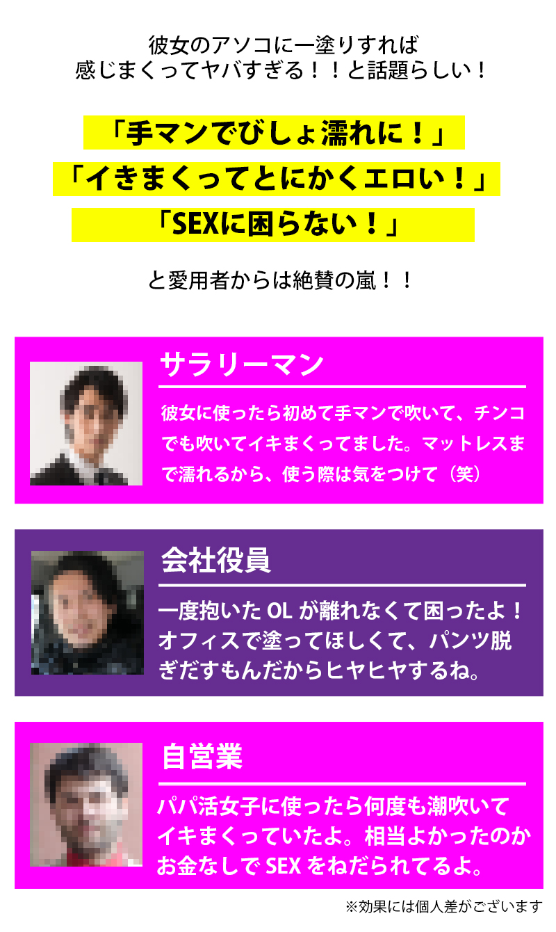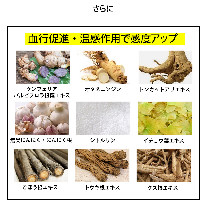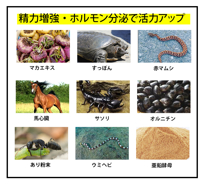 | 原材料名 | 精製水・PG・カルボマー・シトルリン・ガラナ種子エキス・トンカットアリエキス・ケンフェリアパルビフロラ根茎エキス・プロパンジオール・マカエキス・スッポン・赤マムシ・オタネニンジンエキス・亜鉛酵母・サソリ・蟻粉末・無臭ニンニク・ウミヘビ・パフィアエキス・馬の心臓・タチジャコウソウ花/葉エキス・トウキセンカ花エキス・ゴボウ根エキス・レモン果実エキス・セイヨウキズタ葉/茎エキス・オランダガラシ葉/茎エキス・セージ葉エキス・サボンソウ葉エキス・クズ根エキス・アロエベラ葉エキス・クロレラエキス・加水分解コラーゲン・トウキ根エキス・イチョウ葉エキス・オルニチン・プラセンタエキス・ニンニク根エキス・カキタンニン・銀・ セルロースガム・炭酸水素Na・BG・エタノール・メチルパラベン・水酸化Na・ブチルカルバミン酸ヨウ化プロピニル |