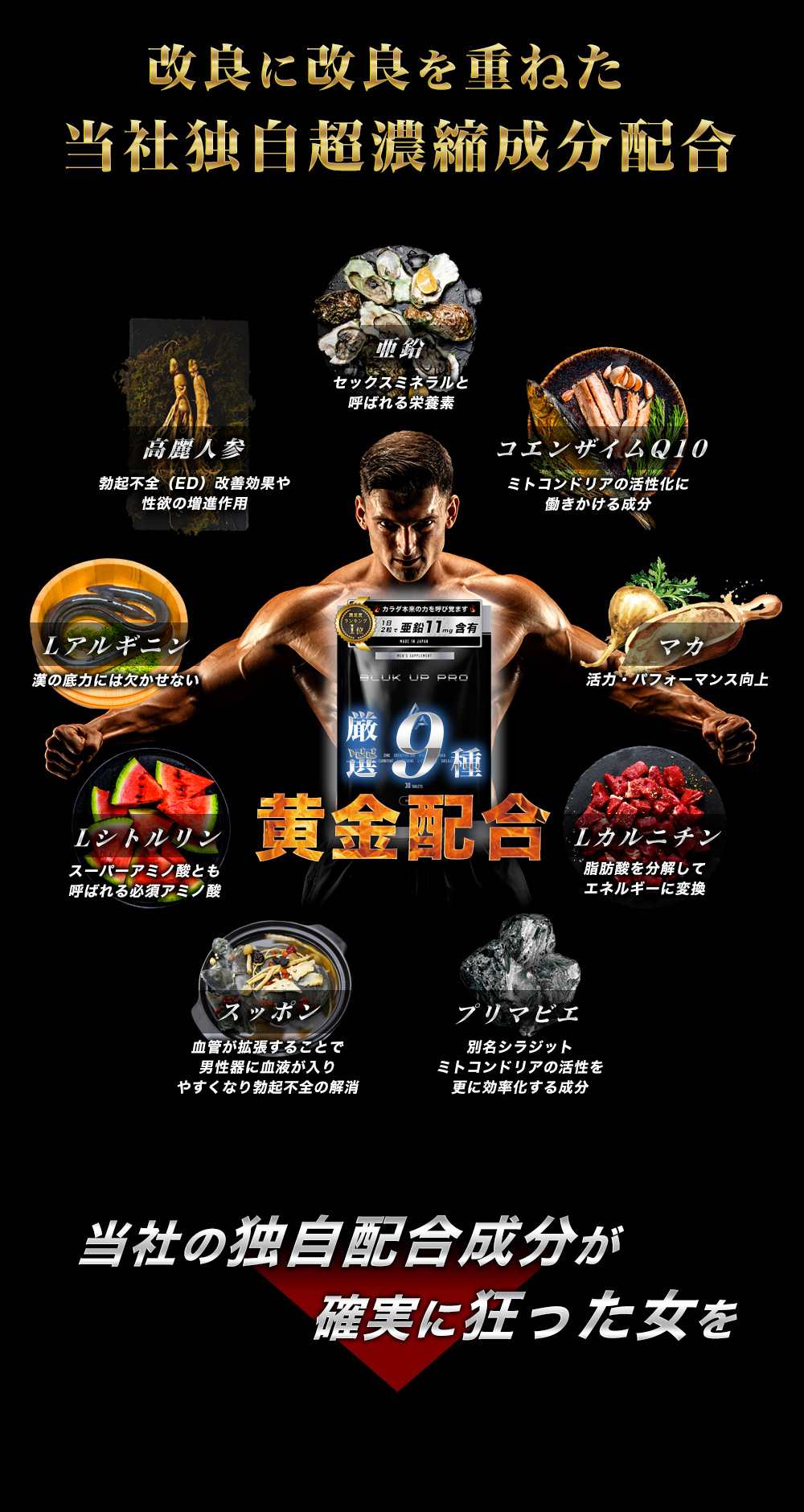 | 原材料名 | 亜鉛酵母、コエンザイムQ10、ビタミンC、有機マカ粉末、L-カルニチンフマル酸塩、 L-アルギニン、L-シトルリン、紅高麗人参粉末、スッポン粉末、シラジットエキス末 セルロース、ステアリン酸カルシウム、二酸化ケイ素 |