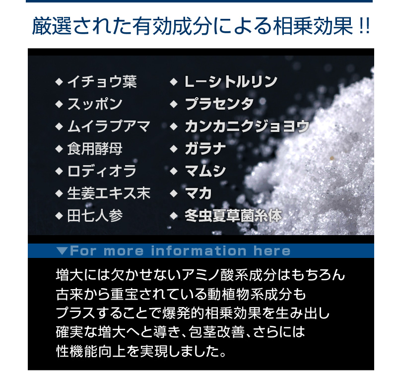 | 原材料名 | L-シトルリン(国内製造)、豚プラセンタエキス末(豚肉を含む)、カンカニクジュヨウエキス、ガラナ末、マムシ粉末、マカパウダー、冬虫夏草粉末、イチョウ葉エキス、すっぽん粉末、ムイラプアマ(地上部)エキス末、亜鉛含有酵母、生姜エキス末、田七人参、ロディオラエキス/セルロース、ステアリン酸カルシウム、活性炭、微粒酸化ケイ素 |