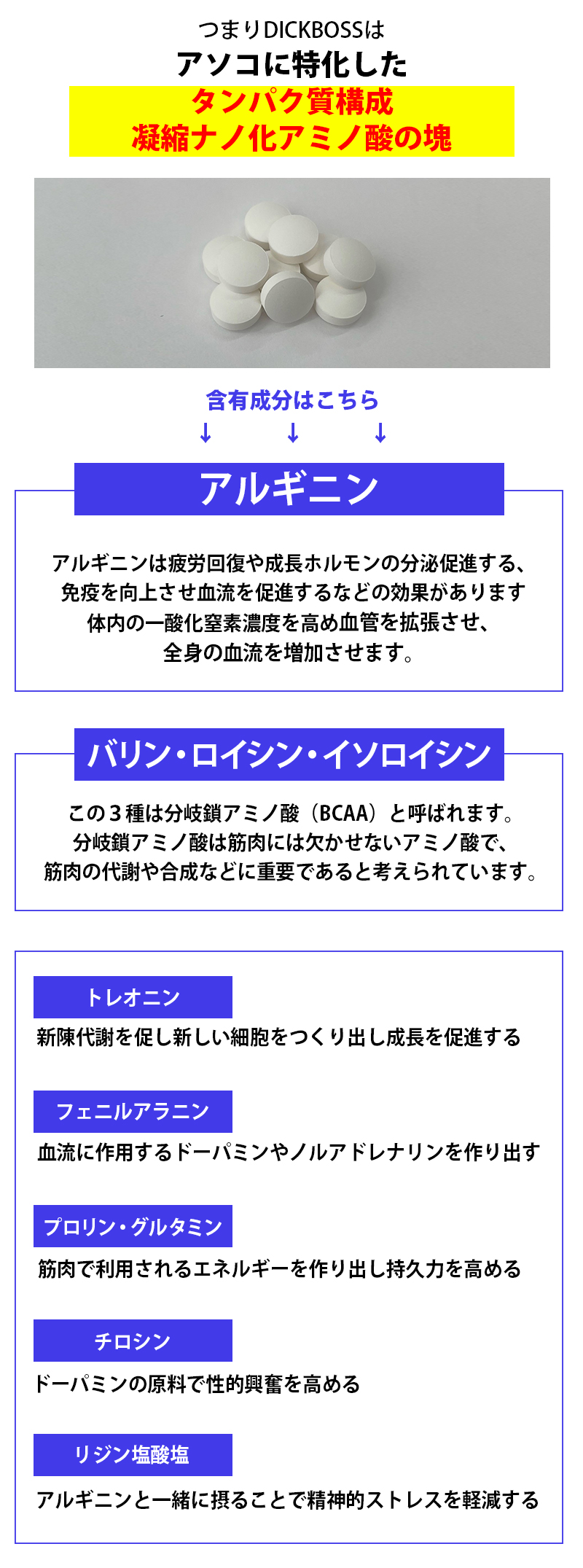 | 原材料名 | セルロース、ステアリン酸カルシウム、微粒酸化ケイ素、L-アルギニン、L-イソロイシン、L-グルタミン、L-トレオニン、L-チロシン、L-バリン、L-フェニルアラニン、L-プロリン、リジン塩酸塩、L-ロイシン |